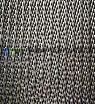 人字型網帶是雙旋網帶的一種變體,依次由左旋和右旋網條形成非常緊密和平整的網面,通常使用直軸但有些規格也可以使用曲軸。網條的緊密性使這種網帶很適合輸送小件產品,例如堅果、螺栓、螺釘、釘子、小甜餅、化工顆粒等。